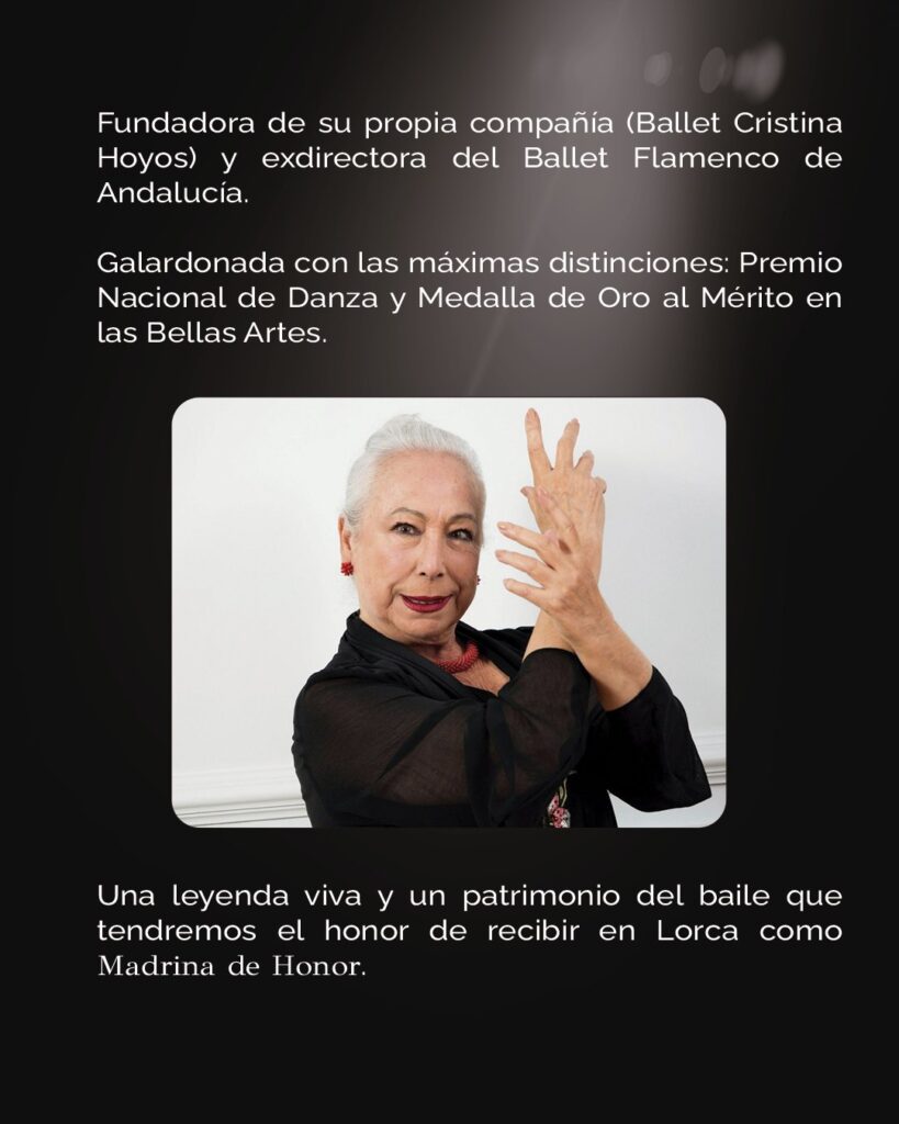 La bailarina y coreógrafa Cristina Hoyos (Sevilla, 1946), ganadora del Premio Nacional de Danza y fundadora del Museo de la Danza Flamenca de Sevilla, será la madrina del XXXIV Festival Internacional de Flamenco Ciudad del Sol, que se celebrará los días 8 y 9 de noviembre en el Auditorio Margarita Lozano de Lorca, Murcia. La artista también impartirá una conferencia en la Casa del Artesano, donde compartirá su experiencia y visión del arte jondo.