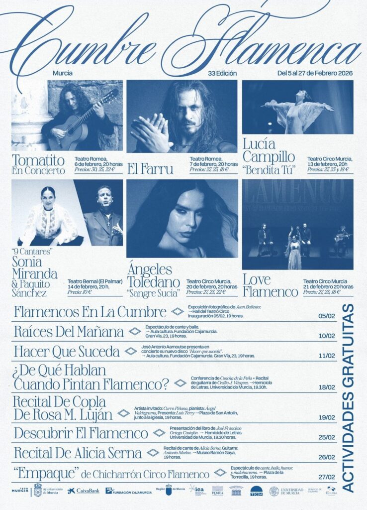 Aquí tenéis la programación completa de la 33 Cumbre Flamenca de Murcia, que se celebrará entre el 5 al 27 de febrero de 2026.
